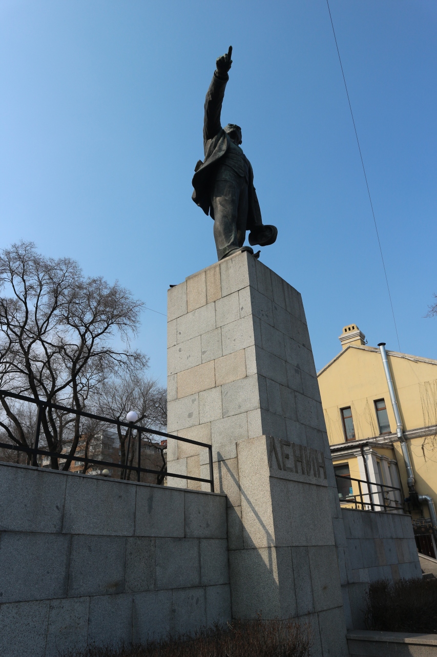 ウラジオストック駅(列車)の駅前のバス乗り場を越えた高台に、立派なレーニンさんの像が立っています。お空を指差して威厳ある姿勢で立ってますので、すぐにわかるでしょう。写真スポットのようでロシア人の人たちも皆さん撮影しておりますので、順番待ちになったりします。結構高い位置にあって大きいので、あまり近いと入りきらないです。