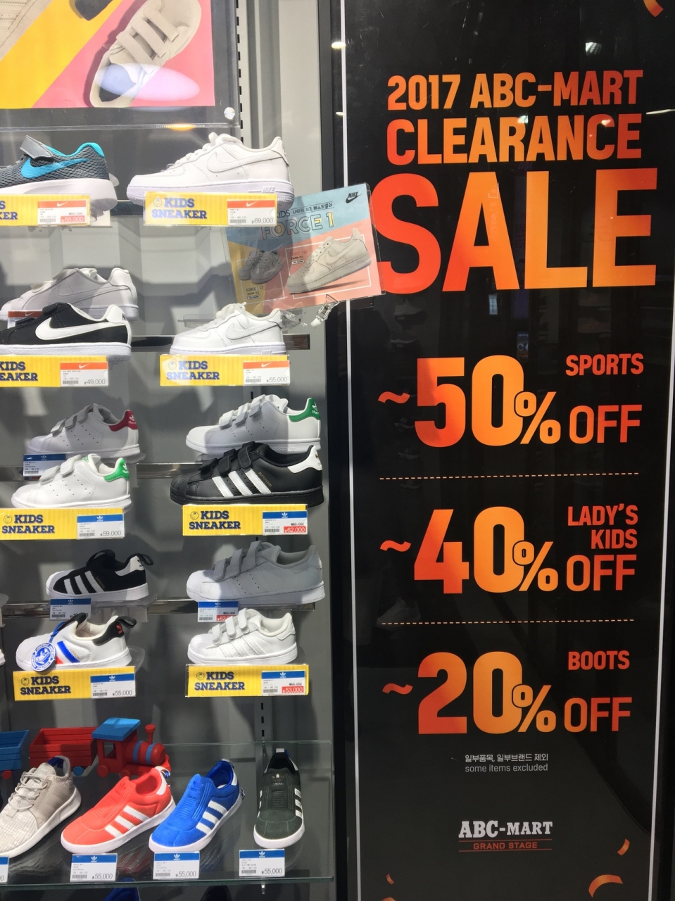 西面の繁華街にあるABCマートで子供のスニーカーを買いました。クリアランスセールの大きな看板にひかれて入ったんですが、スニーカーが安くなっていました。今はウォンのレートが悪いので、このくらいセールにならないとお得感がないですね。良い買い物が出来ました。