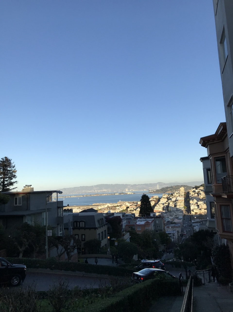 通りの頂上から、写真撮影しながらゆっくりと徒歩で坂を下りました。途中、坂を登ってくる方々とすれ違いましたが、みなさん息を切らしていらっしゃいました。道路は、観光客の車で渋滞していてノロノロ運転でしたが、写真におさめる立場からは、車が並んでいるために曲りくねり具合がよくわかる写真も撮れました。