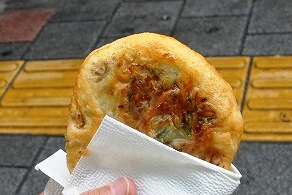野菜の入ったお焼き(100円)を売る店。アツアツで美味しい。いつも行列ができている。
