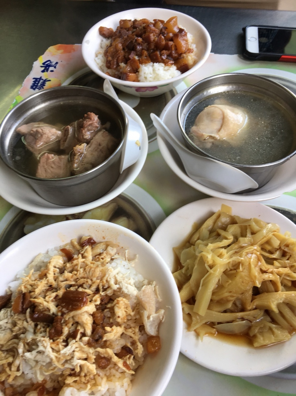 店名から雛肉飯が一番のメニューなんでしょうが、それ以外に、肉燥飯、苦瓜排骨湯、蛤仔雛湯、筍干を注文しました。