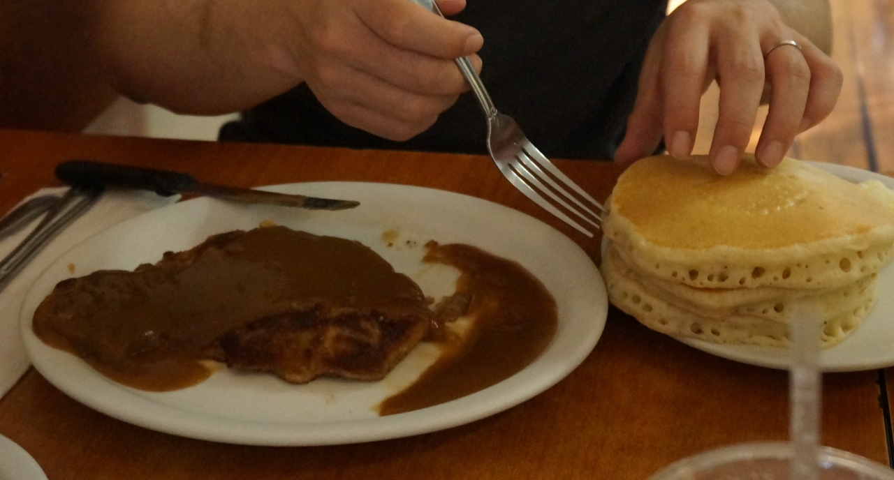 夕方5時半頃、来店したので、空いていました。バナナホイップパンケーキ、チキンカツ、コーヒー、レモネードを4人でシェアしました。お料理が運ばれるまでに、子供には塗り絵とクレヨンを貸して頂けました。チキンカツにはプレーンのパンケーキがついていました。個人的には、この時は甘いパンケーキより、チキンカツとパンケーキのほうが美味しかったです。