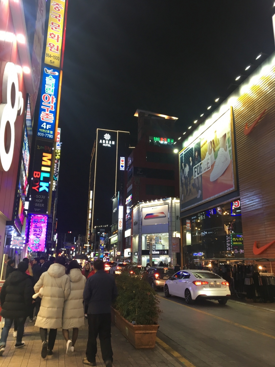 西面は若者や家族連れで朝から夜まで賑わっています。デジクッパを朝早くから楽しみ、小腹が空いたらキンパを食べ、買い物を楽しみ、カフェでゆっくりした後、夜は焼肉…というように一日中遊ぶことが出来る街です。夜は屋台がテキパキと組み立てられて屋台の食べ歩きも楽しむことが出来ます。