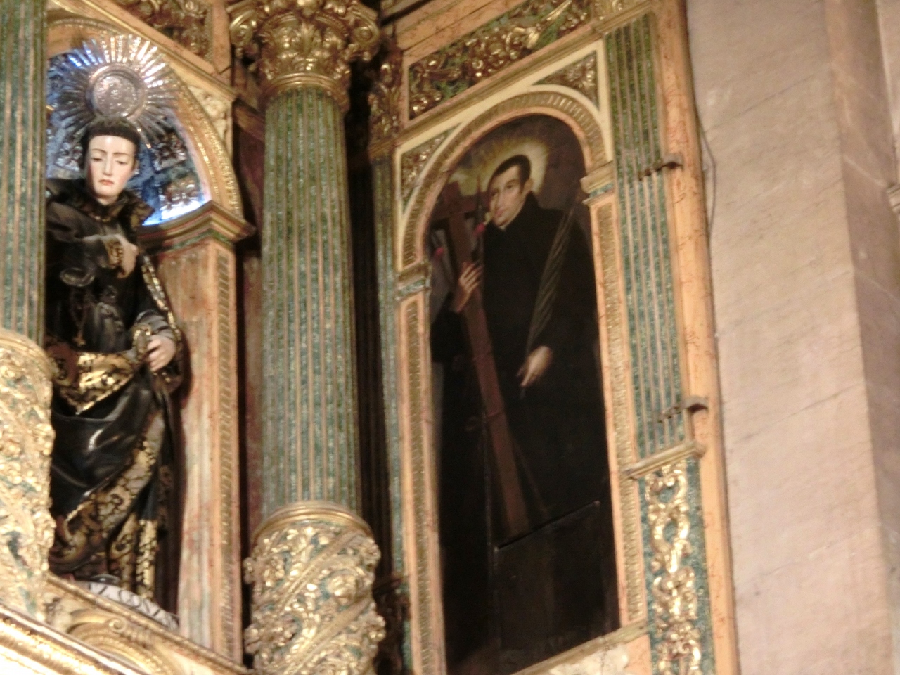 しかし、200年間この教会を所有していたイエズス会にとっては、殉教した3人の日本人聖人の方が印象的だったようで、パウロ三木、ディエゴ喜斎、ジョアン草庵の姿が、何と主祭壇を囲む壁画の中に描かれています。といっても、平たい顔族というよりは、白人修道士に見えるのですが・・・。
