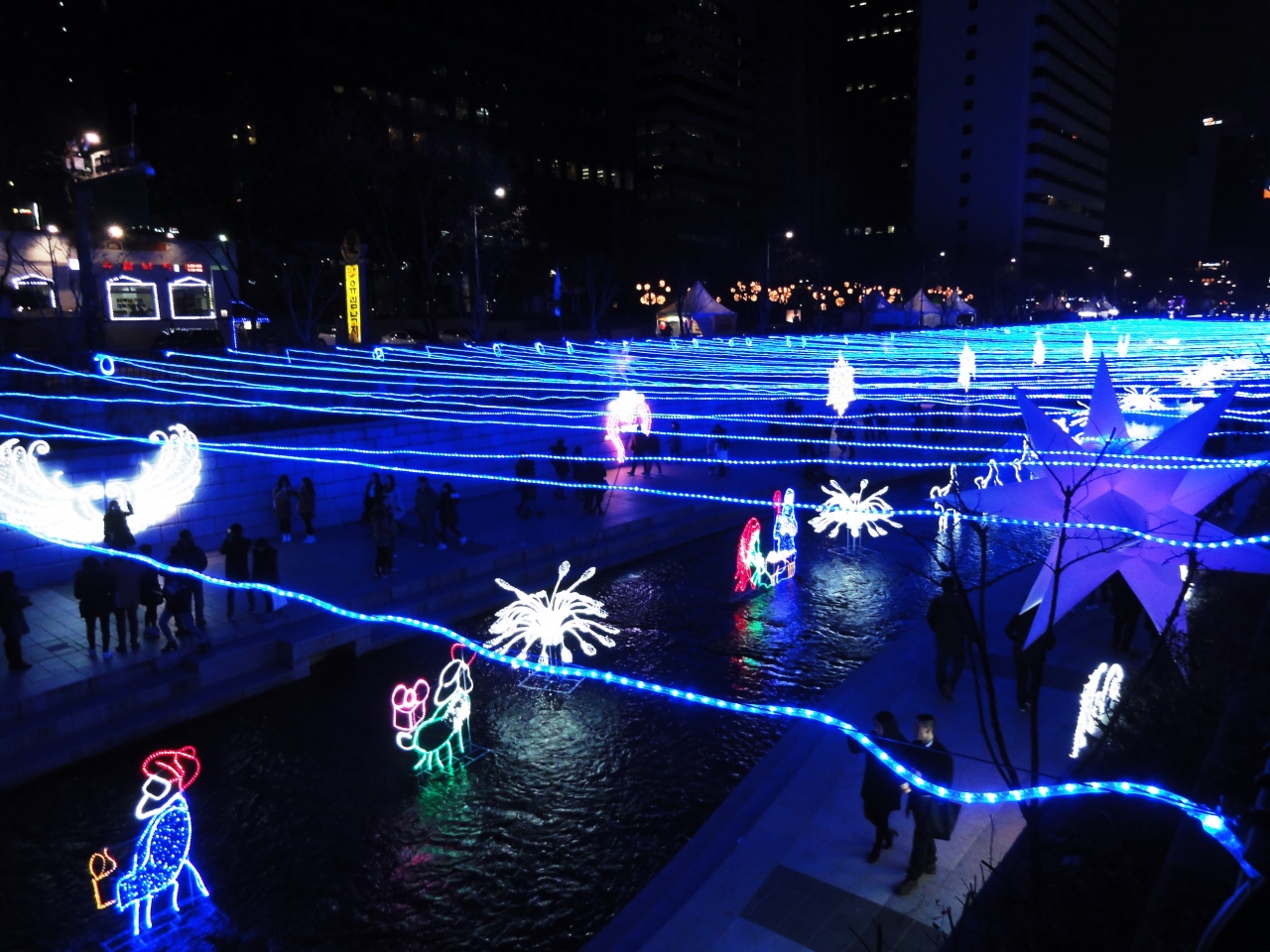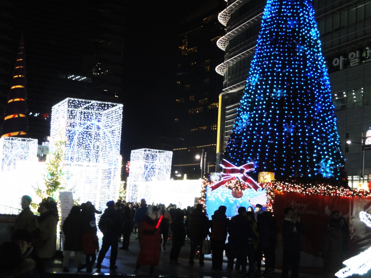 「ソウルクリスマスフェスティバル」に行きました。清渓広場〜長通橋まで約1.5kmの区間がイルミネーションで輝きます。市庁、鍾路、光化門などからアクセスしやすい場所です。大きなクリスマスツリーと、祝福、歓喜、希望、栄光の4つのテーマで構成された鮮やかなLED灯で、幻想的に装飾されています。特にブルーのイルミネーション、本当にきれいでした。人出が多くてもゆっくり歩けます。