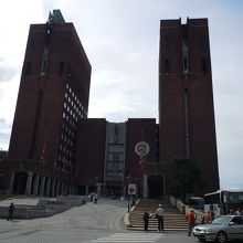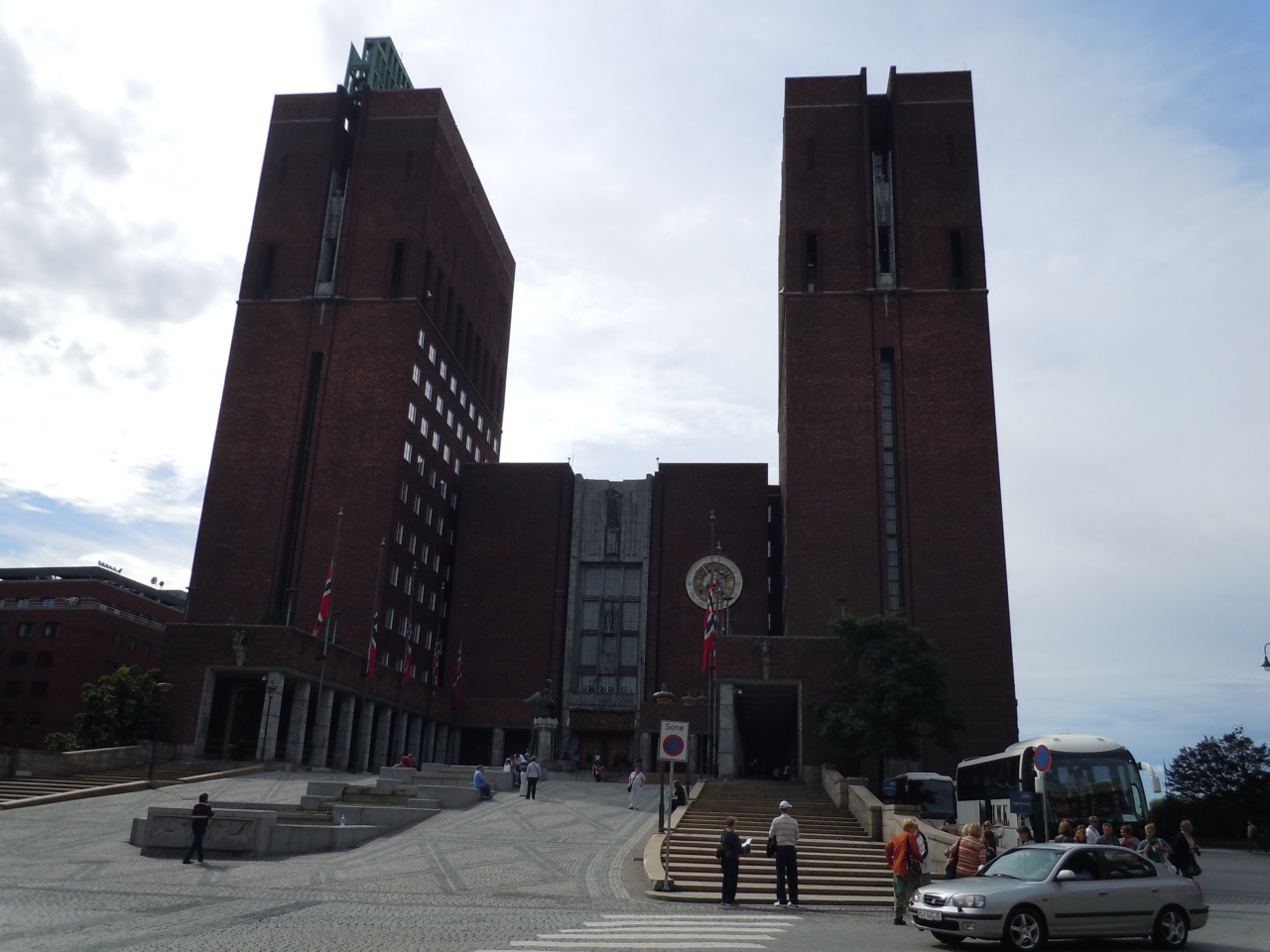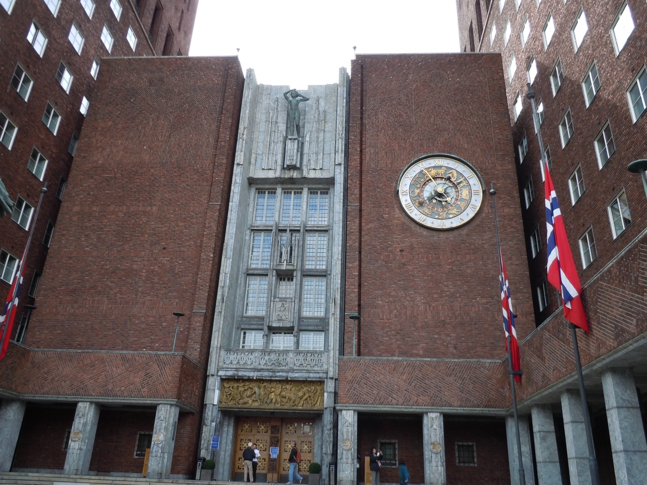 バルト海クルーズでオスロ港に入港。下船して港の目の前にあるアーケシュフース城を見学してアーケシュフース城から徒歩で公園内を少し歩いた所に市庁舎があります。港側からは入場できず、市庁舎の周りを歩いてエントランスへまわりました。外観も正面玄関の方が同じ建物かと思うほど立派でした。