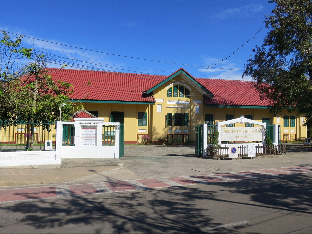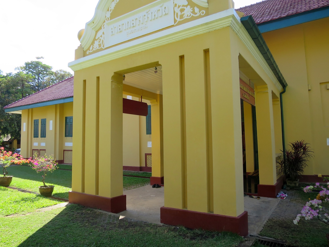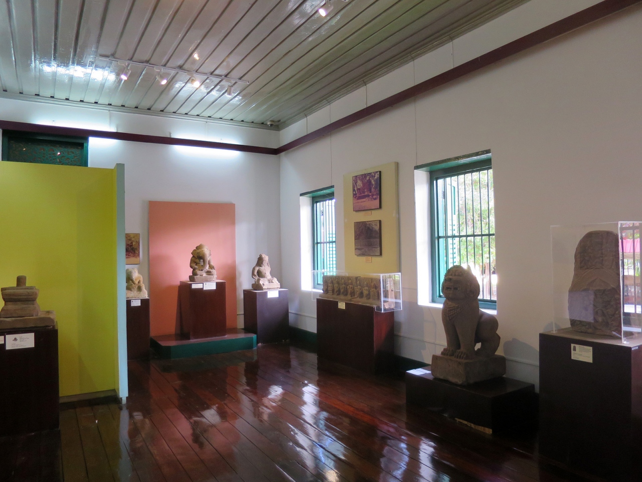 博物館の敷地に入り、左奥へ回り込むとチケット売り場があります。売り場のオバちゃんは髪を見ながらピンセットで白髪を抜く作業に勤しんでいましたが、私が「1人です」と伝えると「日本人?」と尋ねてきました。来館者の統計を取っていると考えることもできますが、外国人料金の適応の確認かもしれません。ちなみに入館料は100THBでした。入口で履物を脱いで館内に入ると、若いお姉さんがチケットに鋏を入れてくれます。かつて市庁舎でもあった建物はあまり広くはありませんが、内側に庭のある回廊式で趣きがあります。もちろんエアコンはありませんが、乾季でもあり、日陰というだけで涼しく感じられました。展示テーマは歴史・民族で、パー・テムにある先史時代の壁画のレプリカもありますが、古代の石像の数々は、その分野に疎い私であっても「凄いなぁ」と思わせるものがありました。また展示品の見せ方も西洋式で、ほとんどの展示品はガラスケースに入っておらず、見学者の善意にまかせる方式でしたが、お国柄ですね。また展示室や展示品の中には経年劣化や傷みが目立つものもあり、もう少し整備が必要だと思いました。あっ、屋外にも展示品がありますので、見逃さないようお願いします。