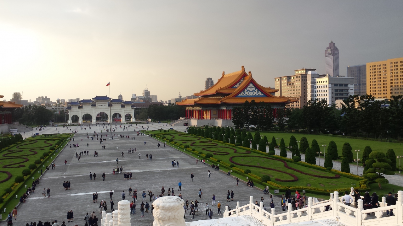 蒋介石の銅像がある記念堂と、目の前は公園で芝生がきれいです。記念堂は衛兵が交代で立って守っています。公園側からは階段で記念堂へ入れ、一階は小さいギフトショップがあります。天気のいい日は白い建物と、緑の芝生が写真映えします。