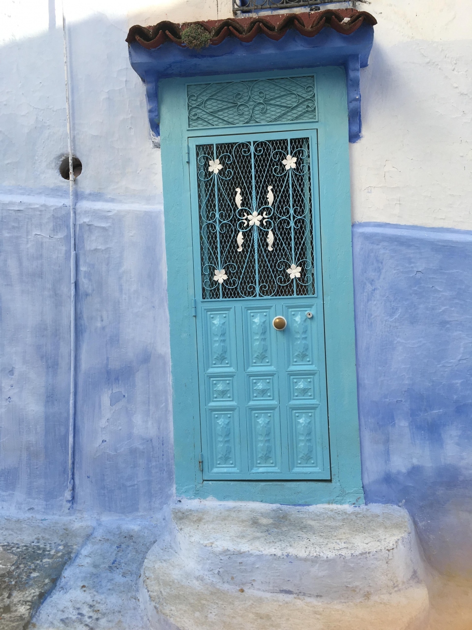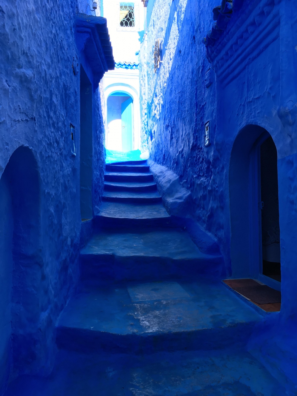 泊まったホテルは アトラス シャウエンという 小高い丘にあるホテル。 朝から シャウエンの素晴らしい全景がみられた。 メディナの旧市街地に入ると そこは 壁も階段も扉も屋根も・・・・すべて 青!青!青! の摩訶不思議な世界です。