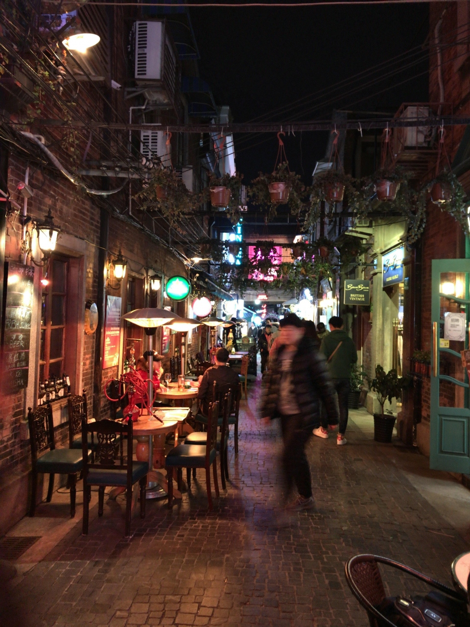 初めて夜の時間に田子坊にきました。夜は寒いにも関わらず、バーで楽しむお客さんが多かったです。お店の照明も相まって昼とは違う雰囲気でした。何も買わず、何も飲まなかったですが、ぶらぶらしているだけで楽しかったです。
