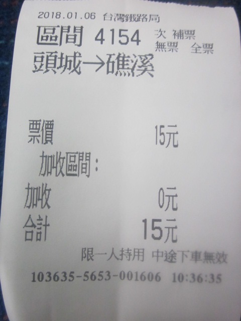 今回は雨に見舞われた旅でしたので、近郊で温泉でも楽しもうかと、台鉄で礁渓温泉に向かうことにしました。土曜日ということで混雑するかなと思っていましたが、お財布重視で各駅停車に乗車。松山駅を出発し、瑞芳辺りまでは混雑していましたが、その後は空いていて、ゆとりのある快適な車内で旅をすることができました。その分所要時間が余計にかかりますが、各駅の様子などを眺めながらのんびりと旅したい、という方にお勧めです。尚、宜蘭線上の瑞芳~頭城間が一日乗り放題となる東北角一日遊と呼ばれるフリー切符が販売されています(126元)ので、これを購入されて、途中下車しながらの旅、というのもお勧めです。