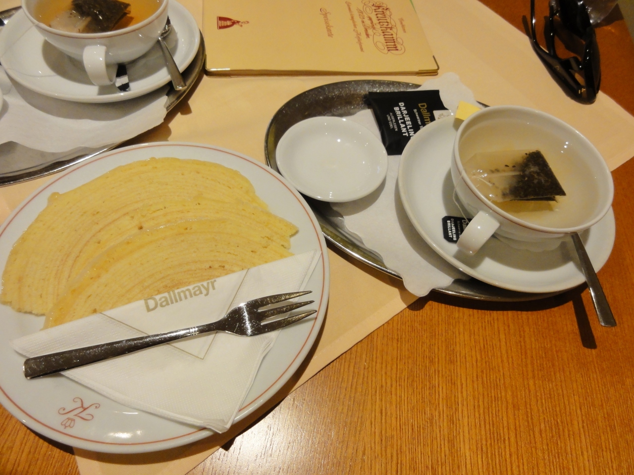 店の入口はケーキやクッキーのショップ。ティールームは店の奥にあり、天井が高く落ち着いた雰囲気でくつろげます。有名なお店ですが、半分くらい席は空いていてスムーズに着席できました。注文して出てきたバームクーヘンはカットが日本と違って横に薄く80gスライスしています。(レシートに記入あり)甘み控えめでおいしくいただきました。