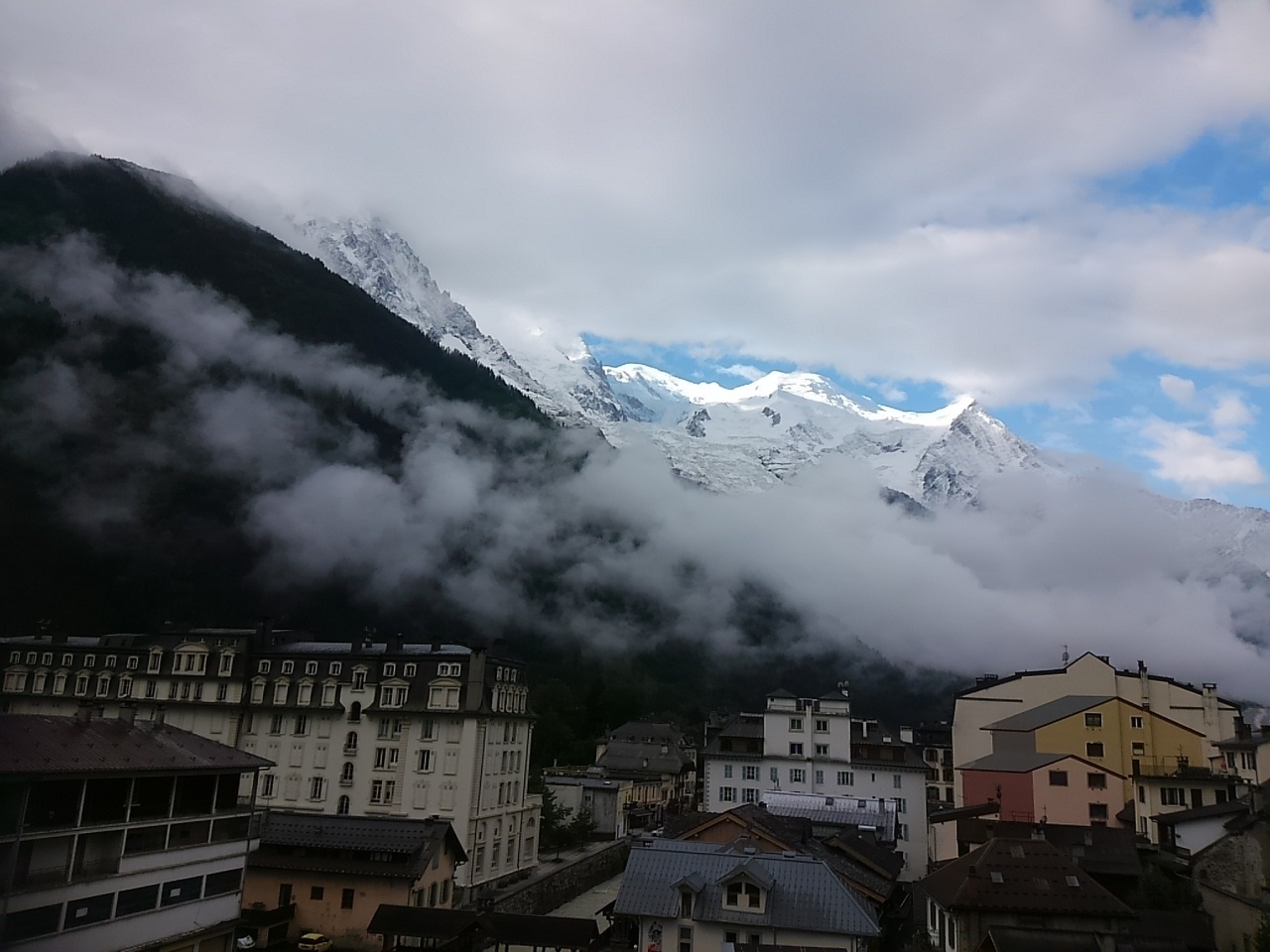 翌日シャモニーのホテルで朝食を取っていると、晴れ間が出て、モンブランの山頂が少し見えました。山頂はなだらかなんですね。