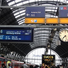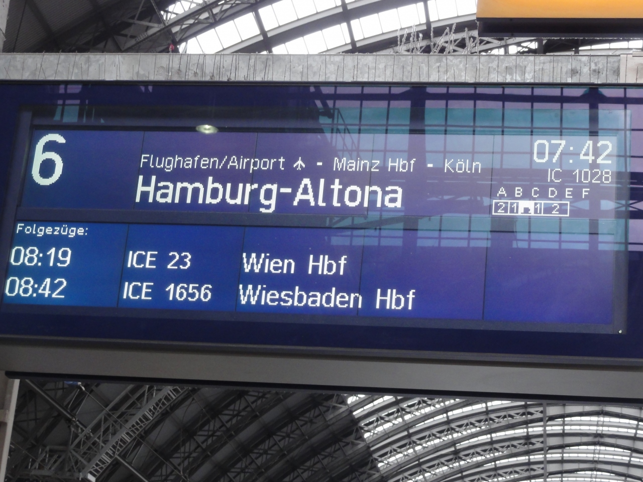 今回、各駅停車を使ってリューデスハイム、マインツ、ICEを使ってヴュルツブルクへ行くため何回か駅を利用しました。ICEのホームは列車の編成が長く、乗降者も多いので混雑していました。駅構内の電光掲示板は行先、乗り場案内と分かりやすく表示されています。フードショップも多く便利です。