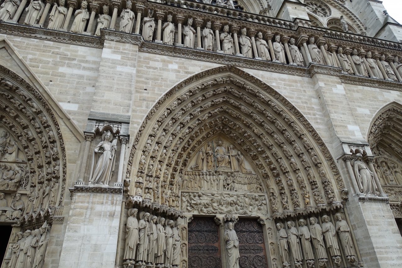 ノートルダム寺院の正面の前には広い広場があり、そこに座って間近で見上げるノートルダム寺院は、特に壮大できれいです。近づいて見ると、繊細な彫刻が一面に施されているのもわかります。正午ごろに行きましたが、寺院の中に入る人の列が長く延びていました。