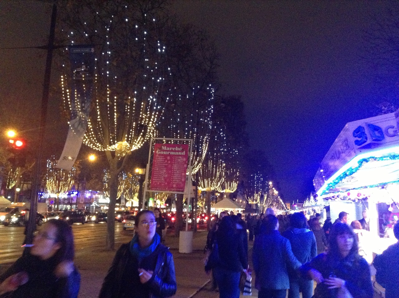 はじめてシャンゼリゼのクリスマスマーケットを見学。とてもにぎやかで楽しかったです。シャンパーニュの屋台や雑貨の屋台、また、スモークサーモンの半身をじっくり炭火であぶっている屋台など、どれもとても個性的で面白かったです。