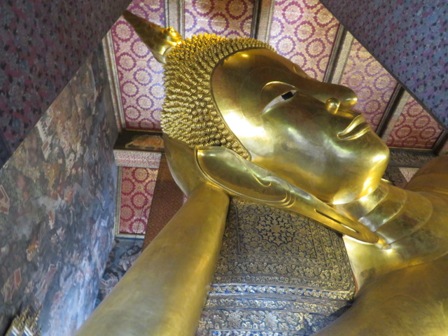 バンコク市街の王宮のそばにある寺院、仏殿内にある巨大な釈迦の涅槃仏が見ものです、金色の涅槃仏を一周しながら見ました、長さ46m、高さ15mの大きな仏像で仏殿の殆どを占めています、ここはタイ式マッサージの総本山として知られていて境内で受けることが出来るようです、そばにある王宮・ワットプラケオやワットアルンと一緒に歩いて回りました。