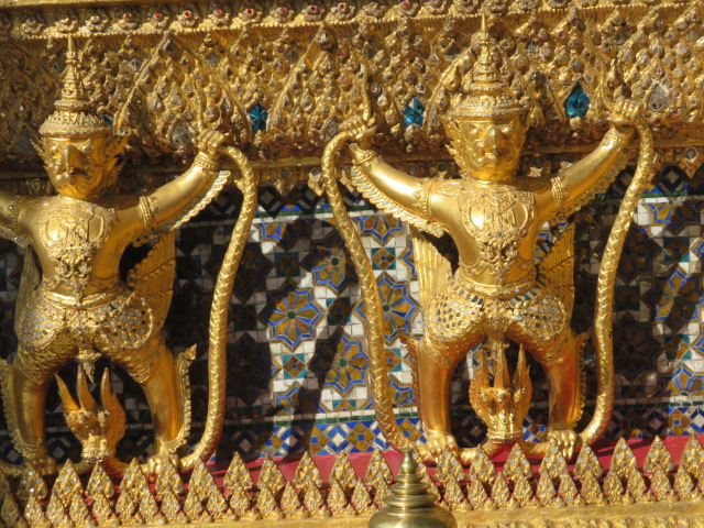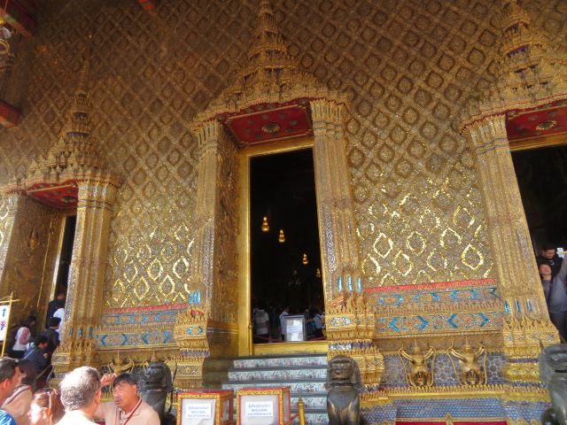 バンコク市街のチャオプラヤ川近くにあり、近くにある、ワットポー、ワットアルンと一緒に歩いて回りました、広い境内を同じ境内にある王宮の建物を見たり、仏塔やヤックを見たりしながら本堂内を見ました、本堂内にはエメラルド色した仏像がありエメラルド寺院と言われるようです。