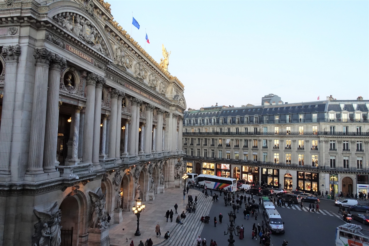 地下鉄のオペラ駅の真上、デパートやお店が集中している便利な場所の中心に、この劇場があります。劇場の前にはいつも大勢の人が集まっていて、劇場前の階段に座っている人も大勢いて、賑やかで楽しそうな雰囲気でした。