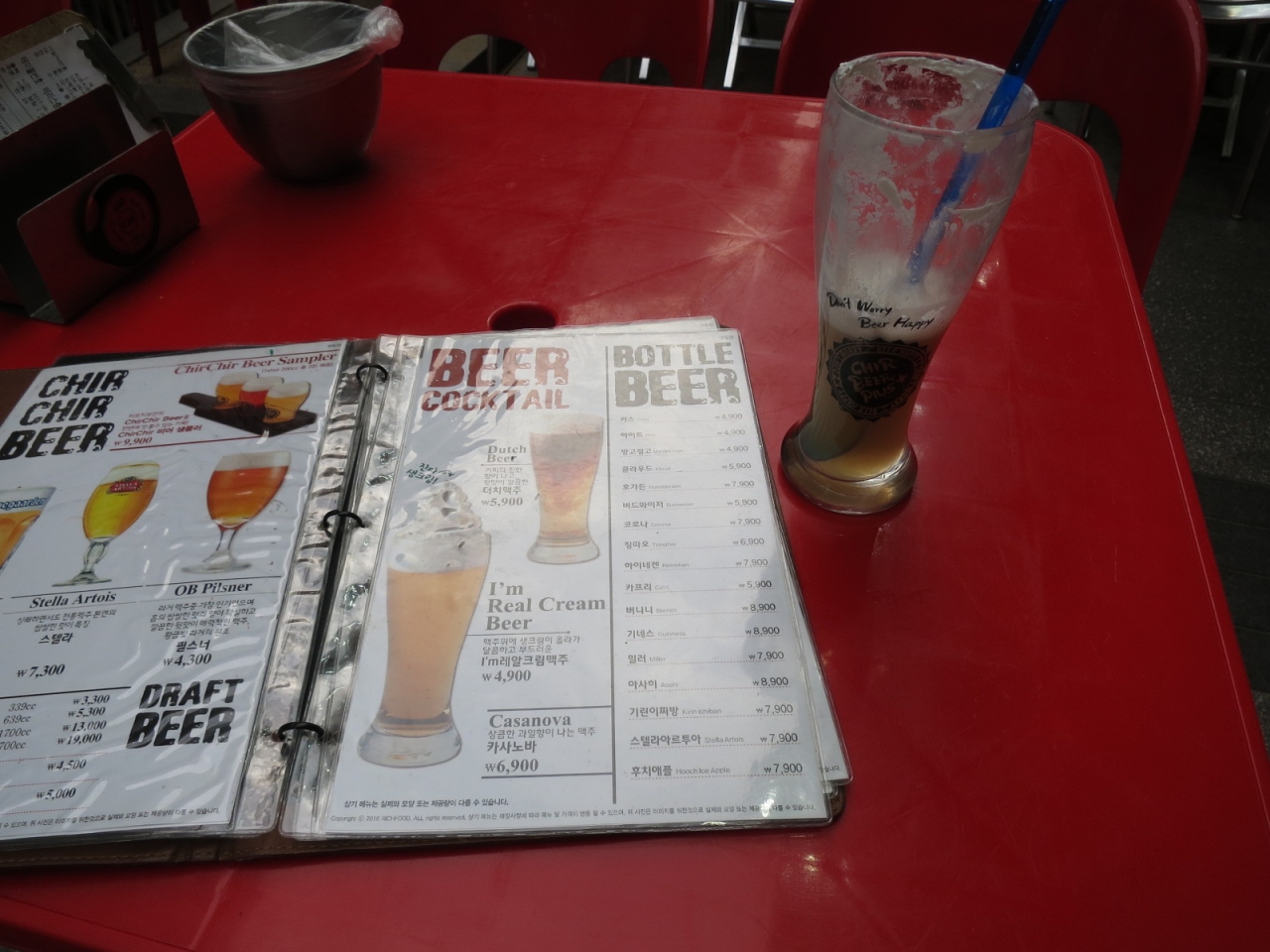 今回,生クリームビールが飲めるという話しを聞いて「チルチル」に入ったのですが,1人旅と言うこともあってつまみの選択はパスして,生クリームビール1杯(₩4,900)だけ飲んできました。…お店の人,ゴメンナサイ!
