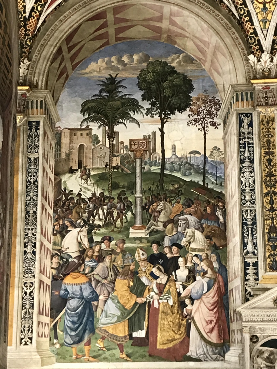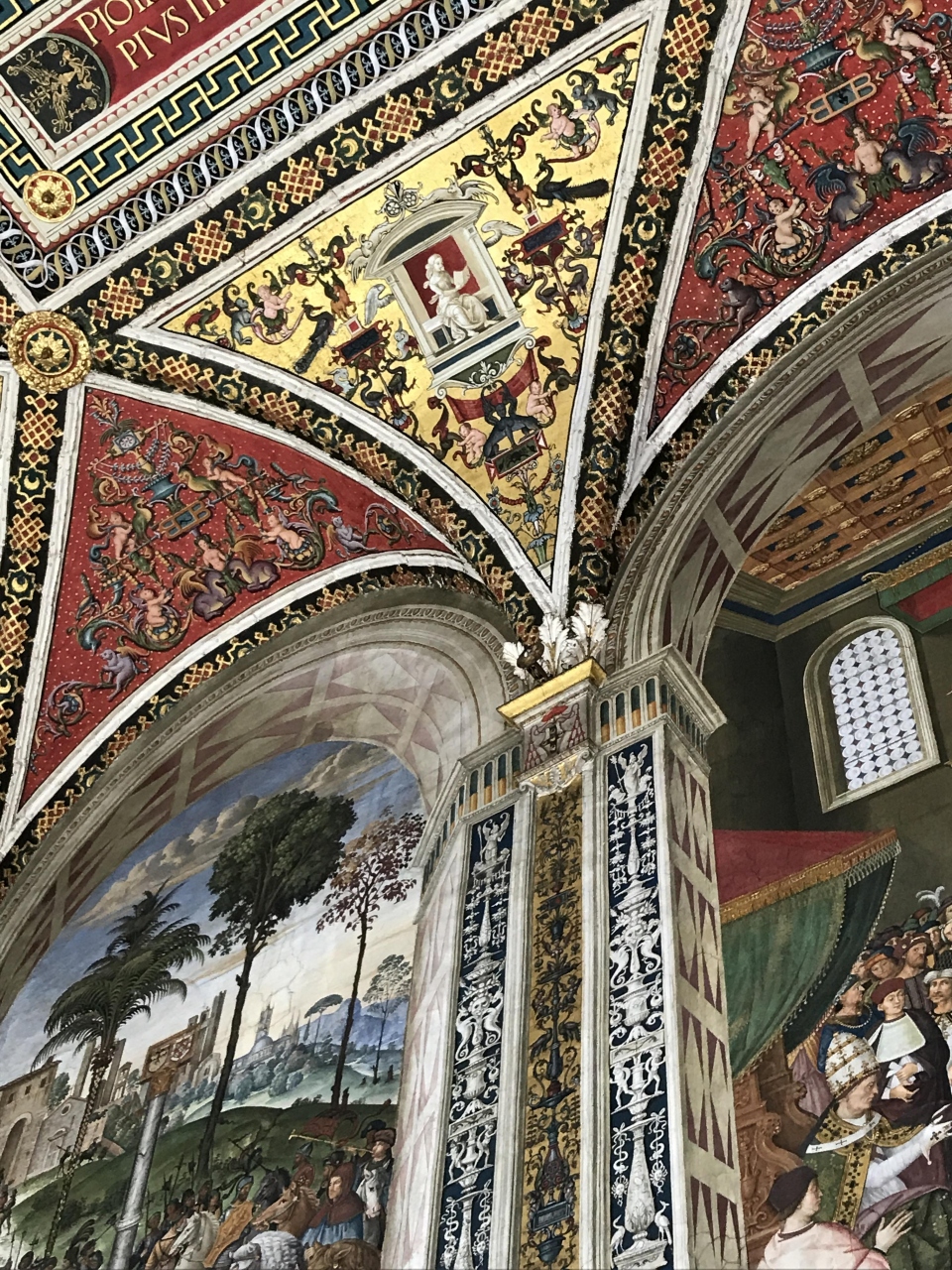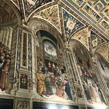 ピウス2世の生涯・功績の数々のフレスコ画が壁を覆っています。