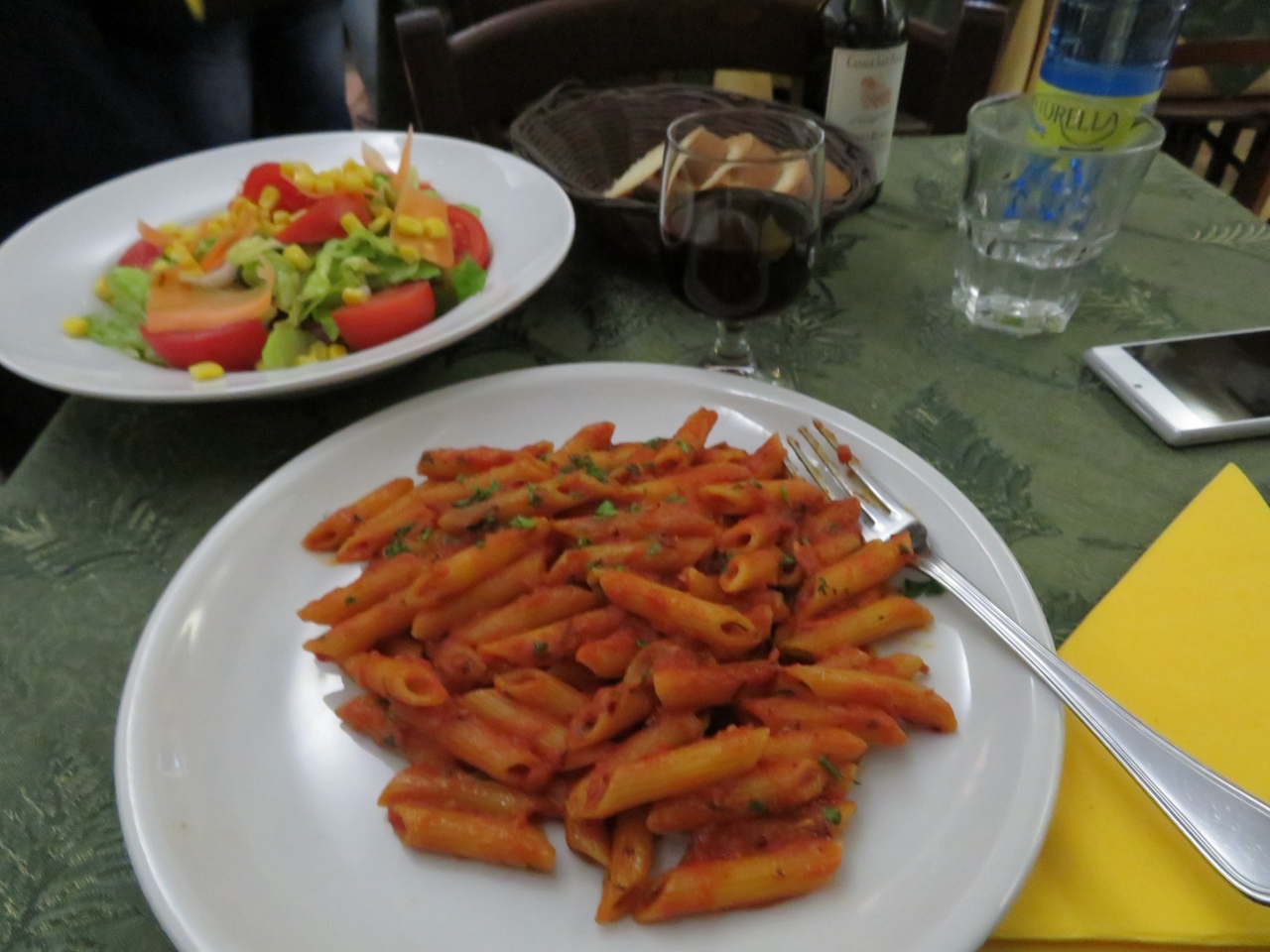 美味しいパスタとサラダ、ワインが15ユーロせずに楽しめる、人でごちゃごちゃしていない環境でリーズナブルな食事ができるの素晴らしい環境です。