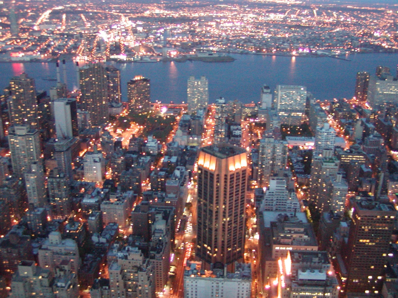 ロックフェラーセンターの展望階から夕暮れのニューヨークを望みました。ロックフェラーセンタービルのいくつかのエレベーターで、並んだ順番で乗れました。ニューヨークの街は碁盤の目になっているので、整然とした街とあまたのビルの夜景が素敵でした。