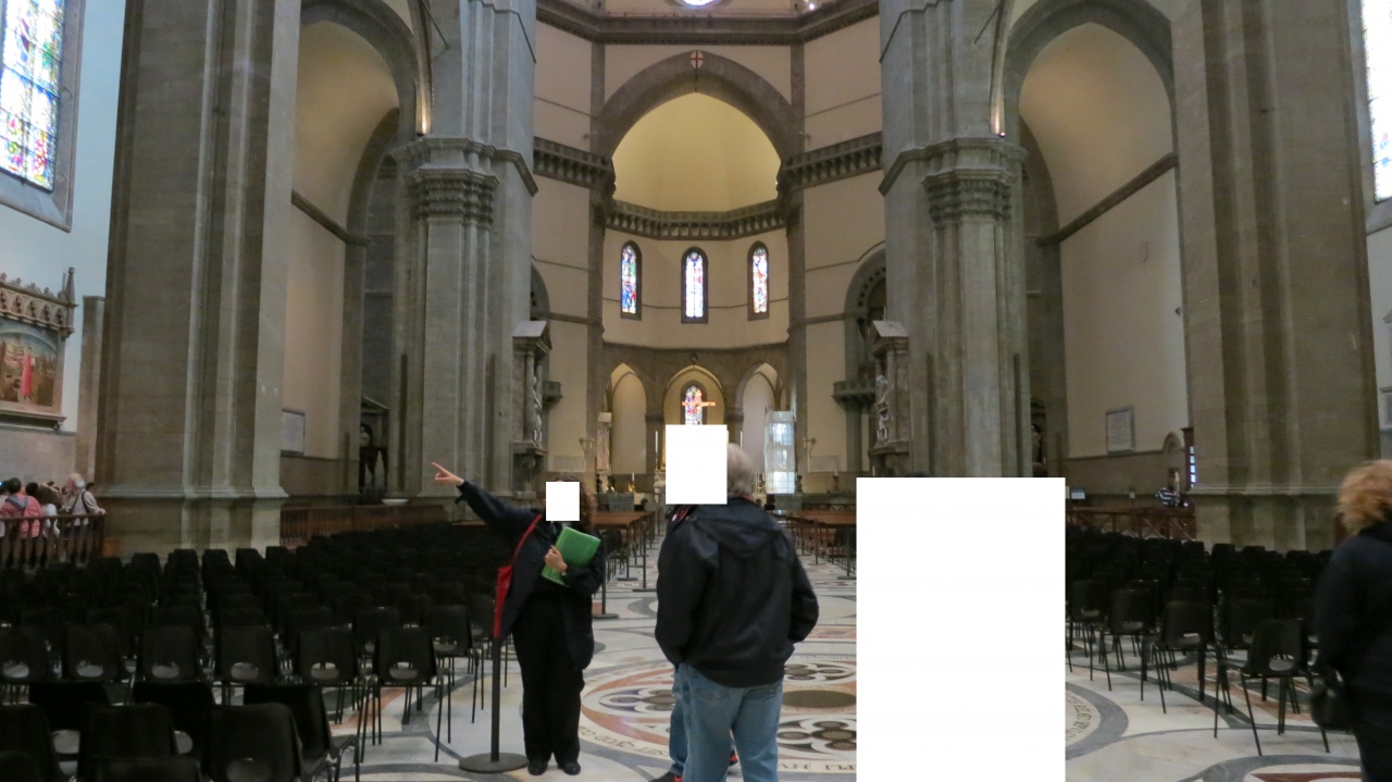 ドゥオーモの屋根の上を歩きたくて「A Little Peek on Florence 」のツアーに参加してきました。屋根の上もツアー参加者以外は歩くことが出来ませんが、訪れたときには何かイベントがあるのかドゥオーモのホールの大半の部分が柵で囲まれ、訪問者が中に入れないようになっていたのですが、ツアーの人だけがその中に入りドゥオーモの色々な部分の説明を受けました。周りの人達は遠くの柵の外側からだけの見学をしていのを見て少し優越感を感じました。