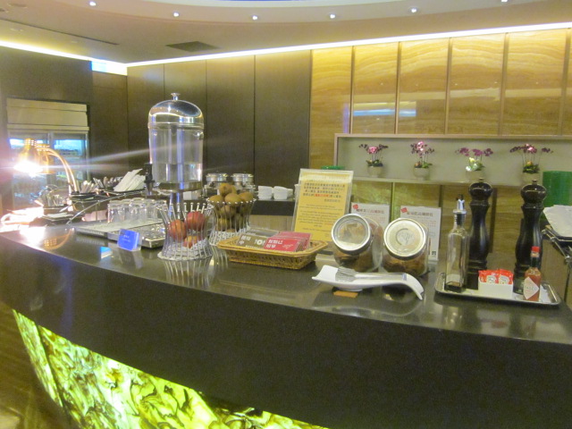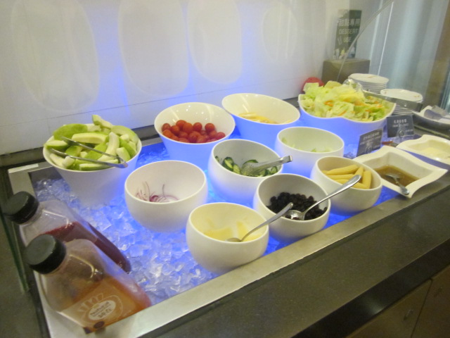 アジア系のラウンジらしく、ホットミールが結構充実していて、焼き芋までも用意されていたのには驚きました。あと、自分で掬って食べるタイプのハーゲンダッツアイスが用意されているのもユニークかなと思いました。(カップのを冷凍庫に用意している、というラウンジは結構あるかと思いますが…。)
