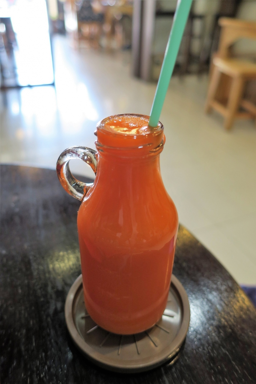 今回は、人参とレモンのミックスジュースをいただきました。水も砂糖も加えていないのに、甘くて、とても濃くてびっくり!甘いと言っても、しつこい甘さでなく、おそらく、人参そのものの甘さなんでしょうね。美味しかったです。