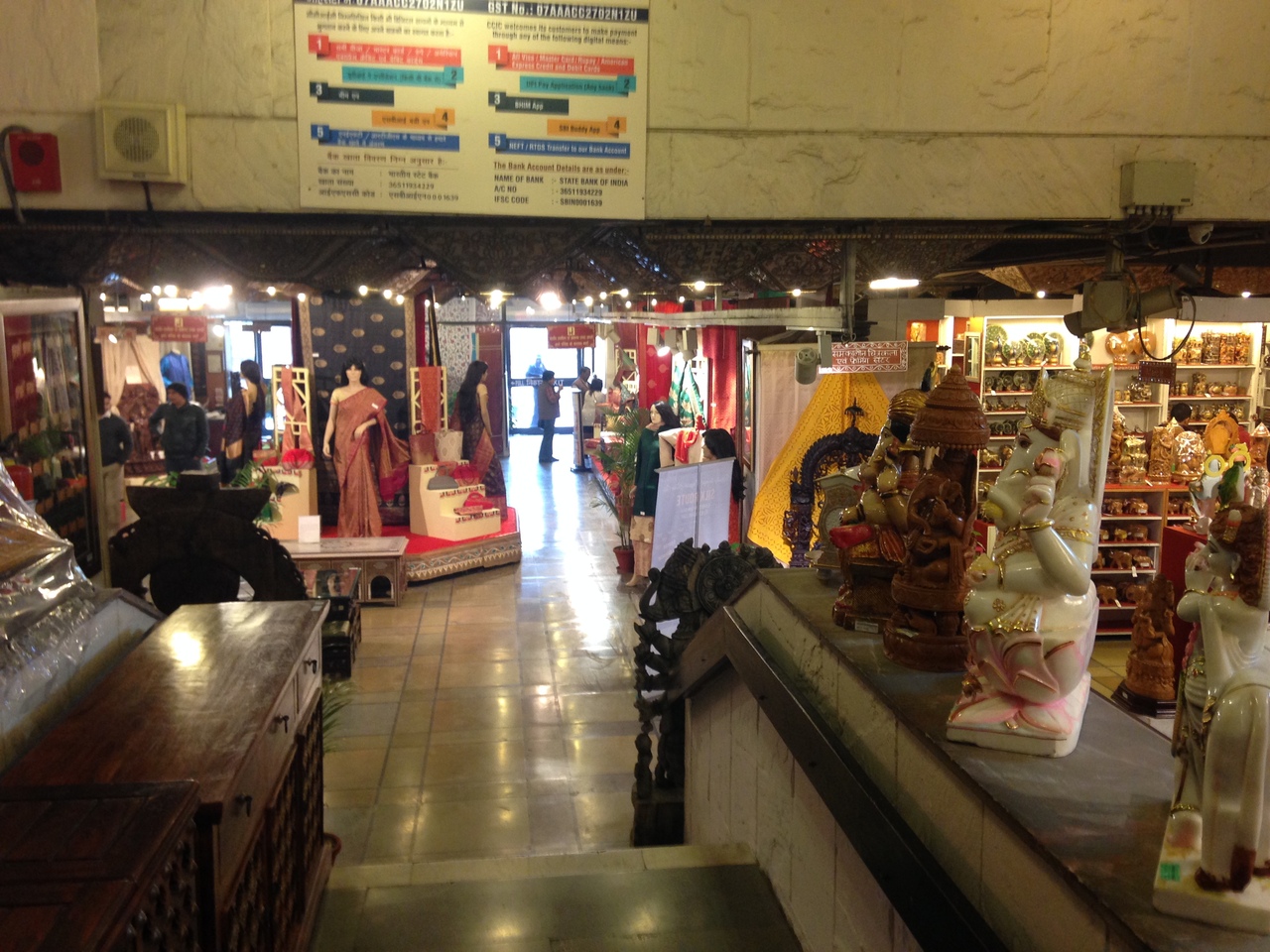 デリー1日観光の時におみやげを買いたい旨をドライバーさんに申し出ましたら立ち寄ってくれました。政府公認で、家具など大きなものから民芸品、化粧品、紅茶、サリーやパシュミナ等、インドらしいあらゆるものが取りそろえられたショッピングモールです。各売り場で購入したいものを預け、1階のカウンターで精算、その後購入品を受け取るカンターで受け取り、との手順です。