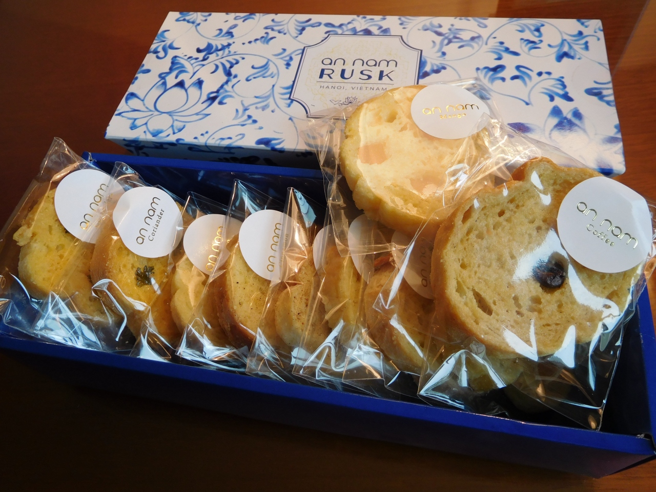 フルーツやパクチーなどの味が楽しめるオリジナルのラスクは、箱のデザインも綺麗でお土産におススメです。