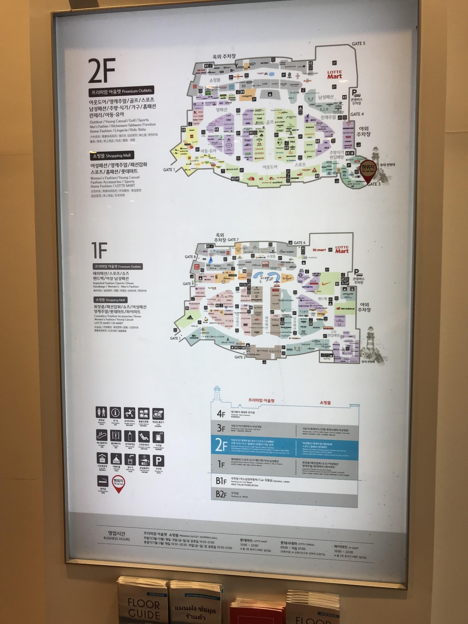 アウトレットモールのブランドはDKNY、UGGA、ZAPAZ、KENZO、NIKE、ニューバランス、グッチ、ナインウエスト、アディダス、サムソナイト、FURRA、フェンディ―、トミーゲス、JEEP、NBA等。高級ブランドとヤングブランドが割合よく配置されている感じ。レストランも有名店や食べ歩き可能な店が多く、ロッテマートや映画館などがあり、1日過ごすことも可能。ただし、韓国の法律でロッテマートは月2回の日曜日が定休日なので、バラマキ土産を購入する際は注意が必要。また、ガイドマップは韓国語、英語、日本語、中国語、タイ語があるが、韓国語と英語以外は切れている場合が多いようで、見つけたらゲットしたほうが良いかも。