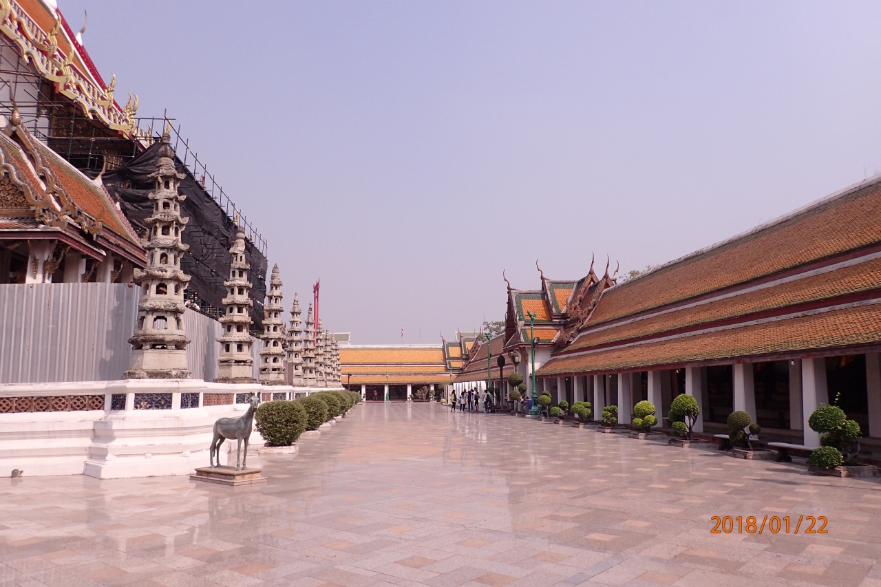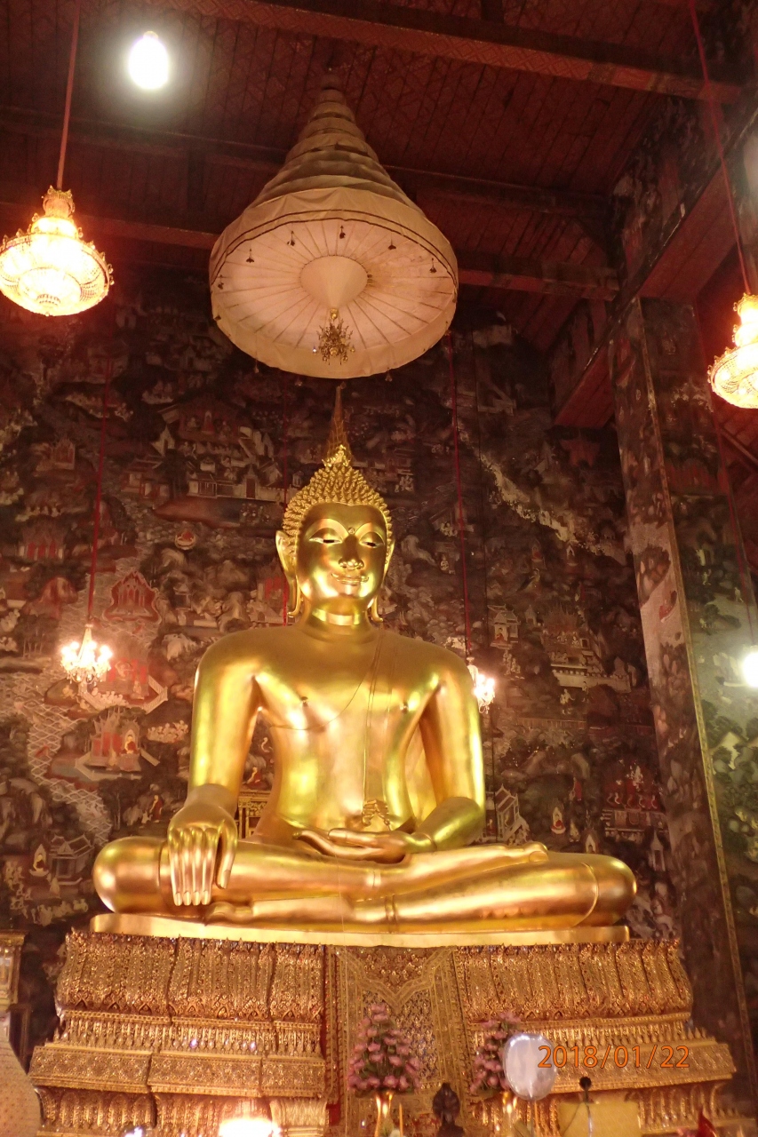 行き方はワットポー辺りからタクシーが便利だと思います。入口の外にはひと際目を引く高さ20m位の赤い巨大ブランコがあります。以前は実際にブランコとして使用していましたが、危険なため、現在は使用していないとのこと。内部に入ると外側に166体もの比較的大きな仏像が並び、本堂の大仏は大きいため寺院の門から運び入れられずに、塀を壊して搬入されたという。布薩堂には多くの石像、置物、絵画が展示されている等見所が多い。