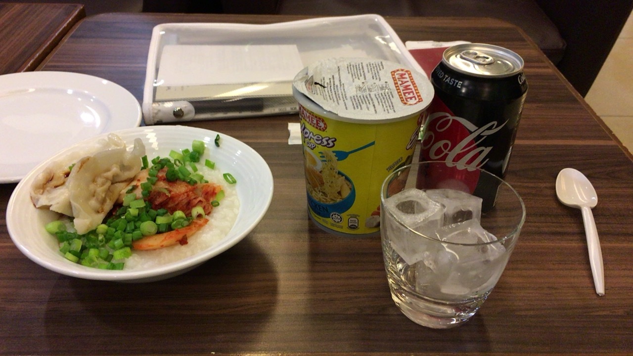 食事はホットドッグや餃子、お粥、炒飯、カップ麺など、ドリンクはアルコール、ソフトドリンクも揃っていました。ソファの背もたれが直角に近く硬かったのが残念でした。しかし、落ち着ける空間でした。