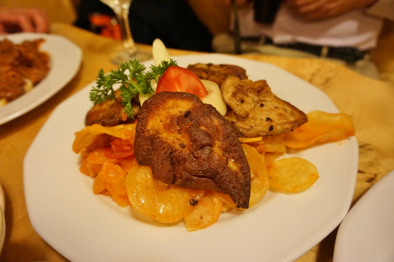 大人4人でフォアグラ、グラーシュ、ウィナーシュニッツェル、カモのグリル、サラダを注文。