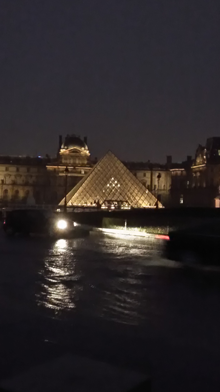 時間の都合上、中に入館できず夜道に立ち寄りましたが、それでも素敵でした。次回の機会があればゆっくり美術館内を見て回りたいところです。夜に照明で浮かび上がったルーヴル美術館、外観だけでも素敵でした。当然ながら警備は厳重でした。