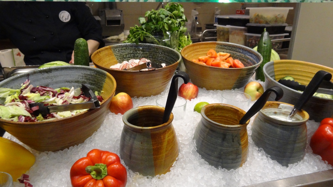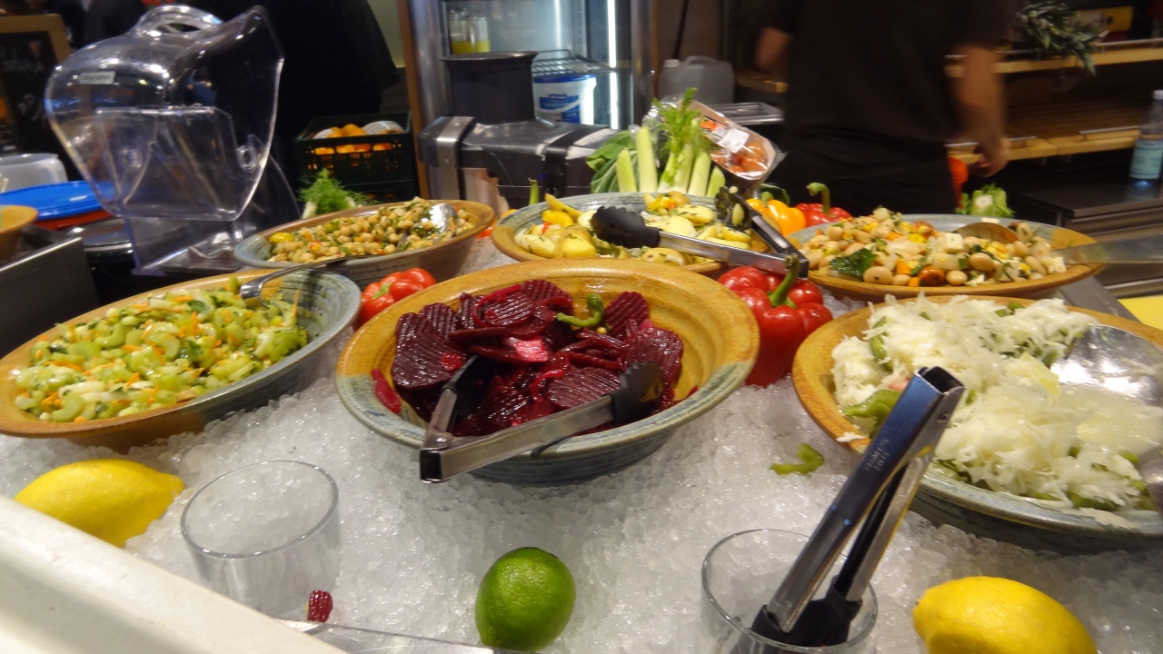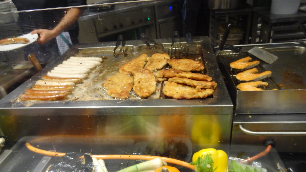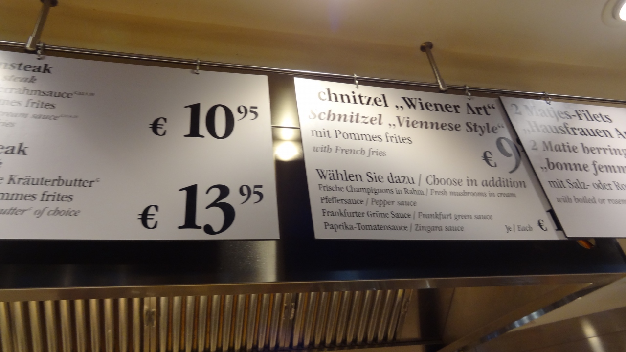 レベル7にLeonhard's & Skyline Dachterasseというフードコートがあり、テラス席からはハウプトヴァッフェの街が見下ろせ、フランクフルトの高層ビル群や遠くの景色も見渡せ、景観は最高です。お料理もドイツ料理、パスタ、中華、デザートなどバラエティに富んでおり、ちょうどお昼時で大変混み合っていました。大か小のサラダボールを選び、ブッフェ形式で好きな野菜を取ります。生野菜や調理してあるものまで種類はとても多いです。メインはソーセージやシュニッツェルなど、上に書いてあるメニューを見ながら注文します。取った料理をトレイにのせ、レジで支払い、席でいただきます。室内とテラス席があります。シュニッツエルとフランクフルトグリーンソースと小サラダをいただきましたが、付け合わせもポテトまですごい量で、かなりのボリュームでしたが、サラダと暖かいお肉はいただけました。気軽に注文できて、種類も多く、景色もすばらしい。お薦めです。