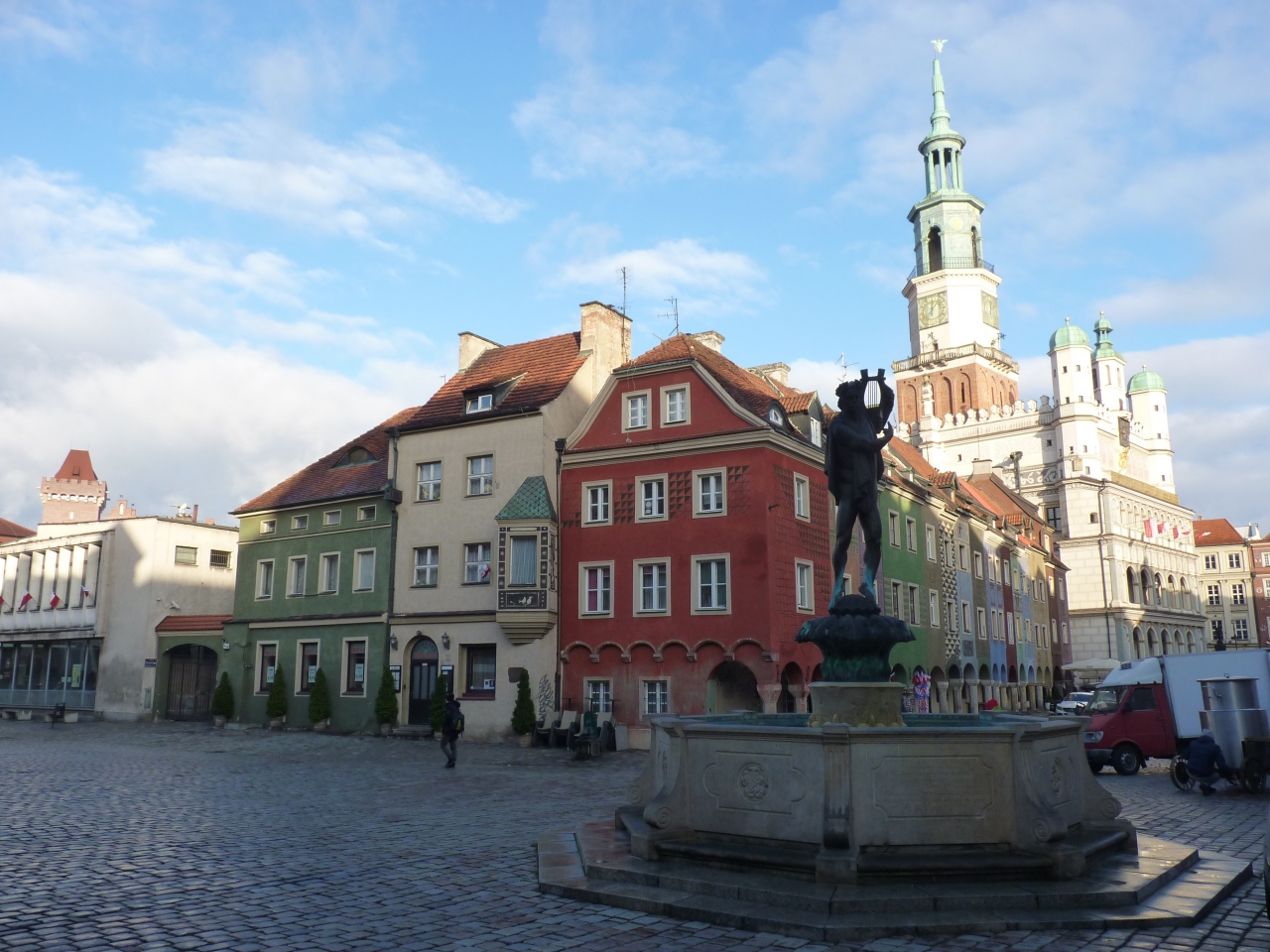 この街も他の街と同様ドイツ軍の砲撃で廃墟となったが、現在見事復元され、16世紀に建てられたイタリアルネッサンス様式の市庁舎も美しい姿を見せている。この塔にはヤギをモチーフにしたからくり時計が観光客を楽しませてくれる。町の中心には噴水もあり市民の憩いの場でもある。
