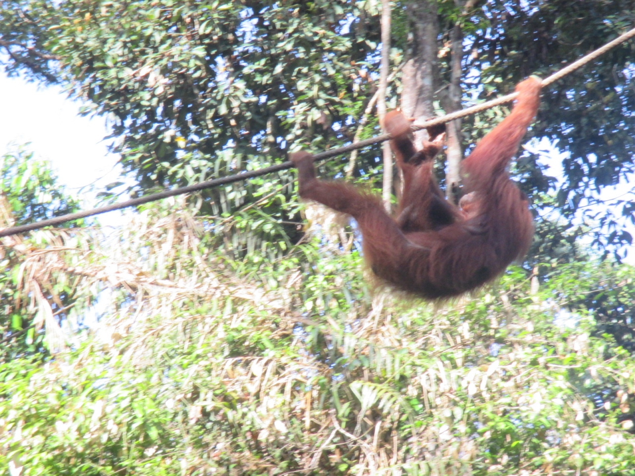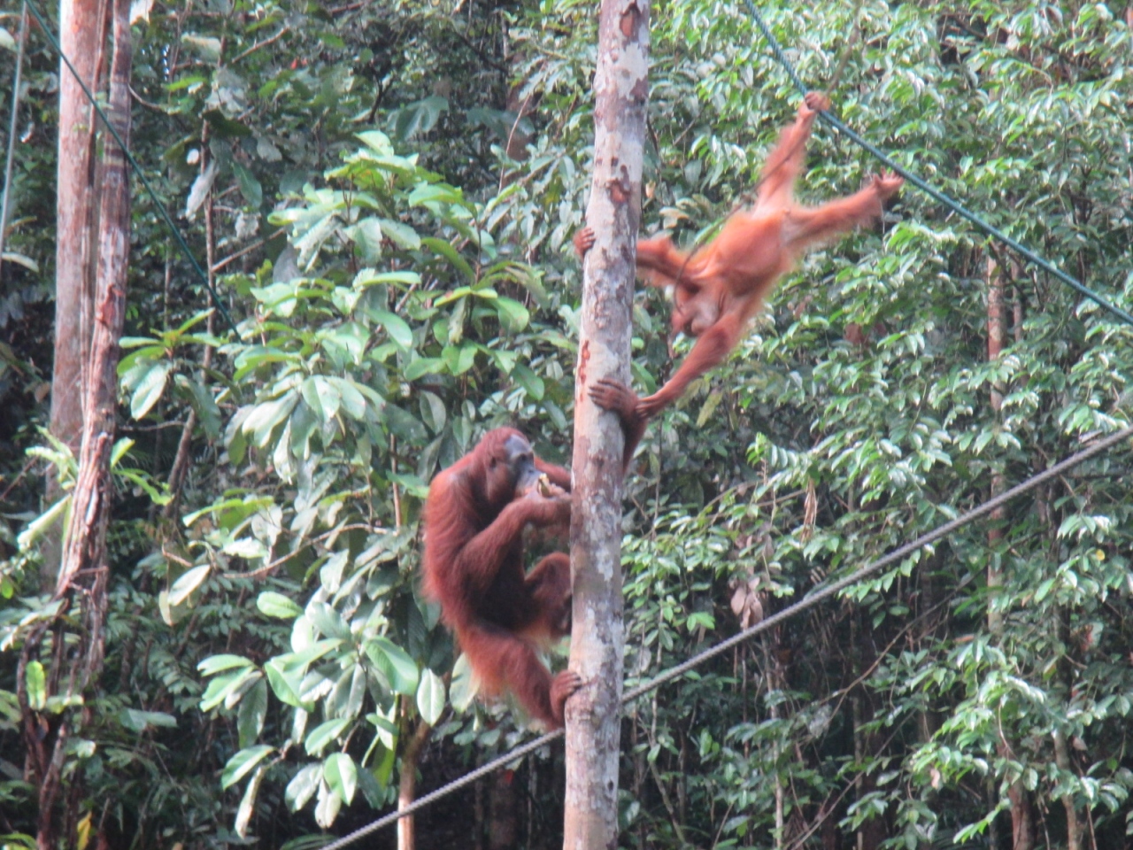 午前と午後に一回ずつオラウータンの餌槍の時間があるので、その時間に向けて出かけます。ガイドの説明によれば、フルーツシーズンに入っているため、オラウータンは自分で餌を見つけることが容易で、出てこないかもしれないとのことでした。あまり期待しないようにトレッキングコースをガイドとともに一段のグループで進んでゆくと、オラウータンを迎える場所に到着します。二匹のオラウータンが出てきて餌をもらって、うろうろしているところを見ることができました。最初の集合場所でも、二匹別のオラウータンが出てきていて、二度楽しめました。ラッキーなほうだったと思います。