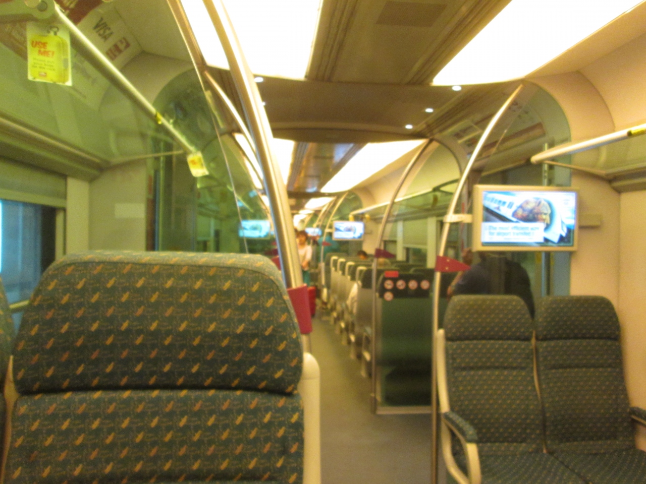 KLIAエクスプレスの座席は4人が座れるボックスシートタイプでした。大体、いつもこのシートを1人で独占して座ることができました。出入口付近に荷物を置く棚がありますが、盗難が危惧されるので、自分が座る近くにカバンを置いて移動できます。