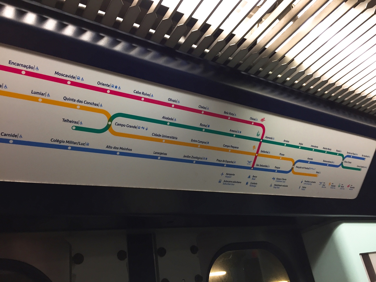 リスボン市内の地下鉄は赤・青・黄・緑の4路線。 路線図も結構シンプルだし、車内にも貼ってあるので、乗換駅さえ間違わず、正しい方向を見極められれば初めてのリスボン滞在であってもかなり便利に移動できます。