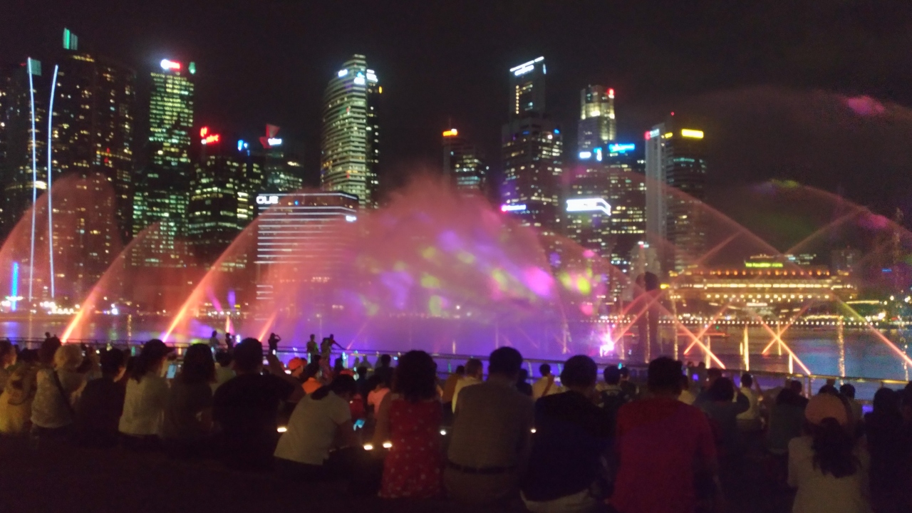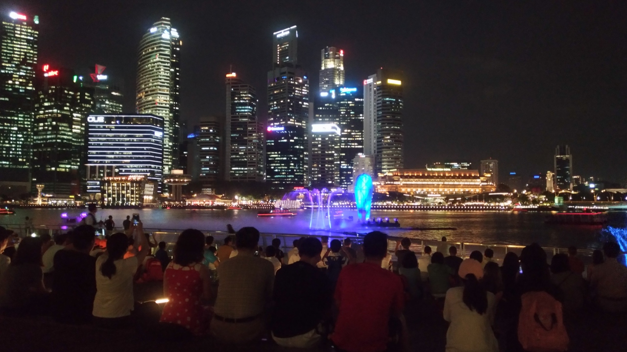 1日に2〜3回マリーナベイサンズの前で行われるショーです。1回目は20時からの開始です。15分ほど前からショーが見れるデッキの前に多くの人が集まってきます。時間は15分ほどでしょうか。内容は時期によって結構変わるようです。