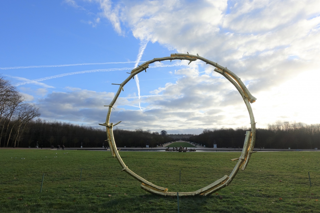 ベルサイユ宮殿内の見学コースが終わると、宮殿の奥に広がる庭園に出ます。対照的な造形美の庭園です。細長い芝生に沿って5分ほど歩くと丸い池があり、その池越しに見る宮殿の裏の姿はきれいでした。金色の不思議な輪が輝いていました。