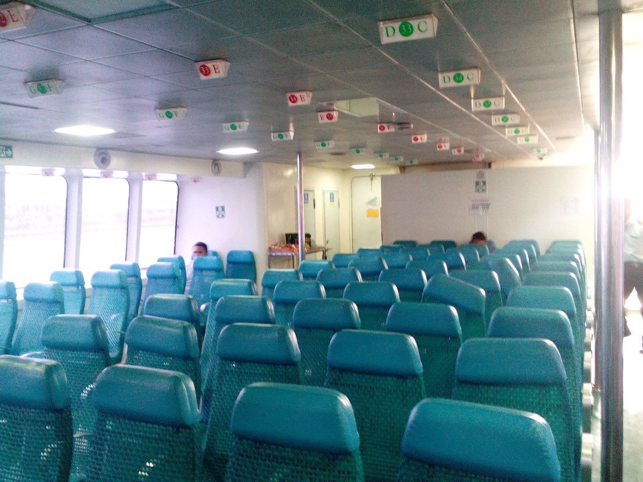 フェリーターミナルに着いて、幾つかのフェリー会社からボホール島行き (片道/ PHP 500) を選び、ターミナル入口で利用料を払ってチェックイン (保安検査あり)。天候 (雨) により約30分出発が遅れました。船内は冷房が強いです
