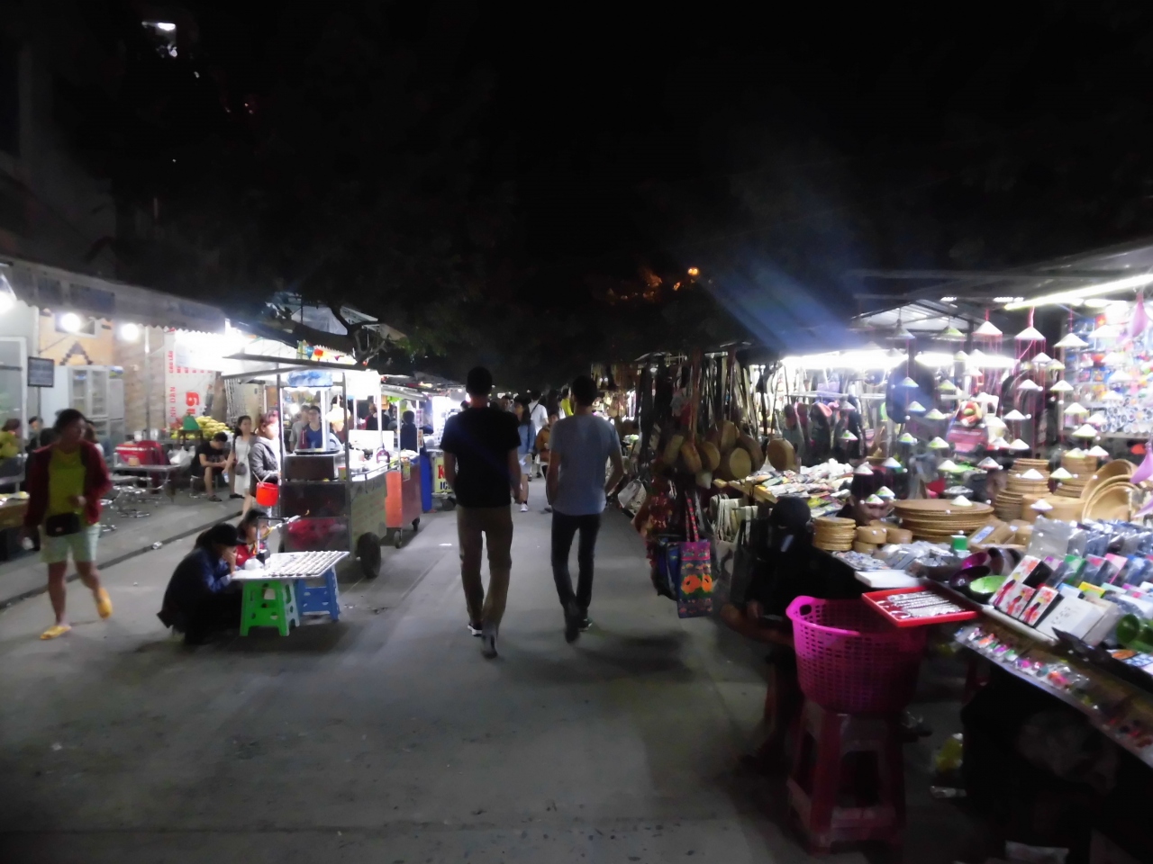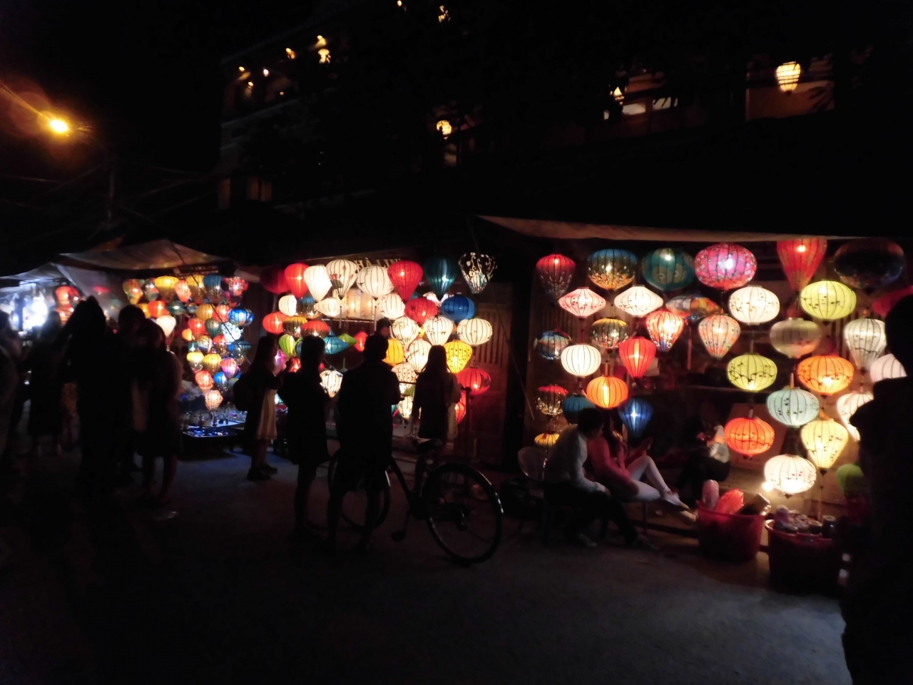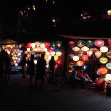 アンホイ島を南北に走るグエンホア通りが夜になると車両通行禁止になって夜店が立ち並びます。一番人目を引くのは、やはりランタンでしょうか。本当に綺麗です。これ以外にも、多くのお土産物屋や屋台が出て賑やかで、冷やかしながら歩くのも楽しいです。