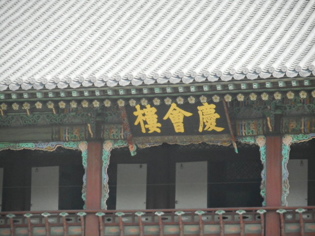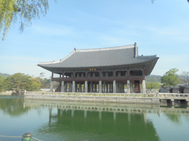 世界遺産の景福宮内にある”慶会楼”は池に建つ二層の家屋で、王と貴族が宴会を行なった場所だそうで、水があるので癒しのスポットと言われています。辺りには喫茶室もあり、ツァーの待ち合わせ場所にもなっていました。