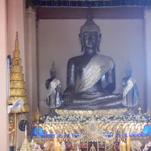 オレンジ色に塗られた柱が何本も見えるのと本堂の建物の前に庇のような部分があるのが特徴的だ。本堂の中に入ることができた。仏像は金属製のようで黒かった。