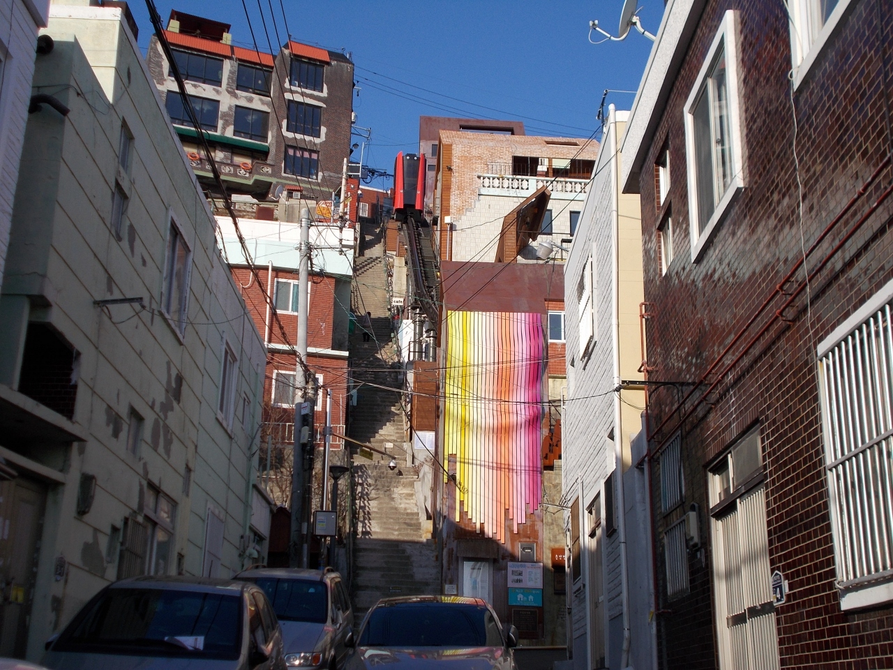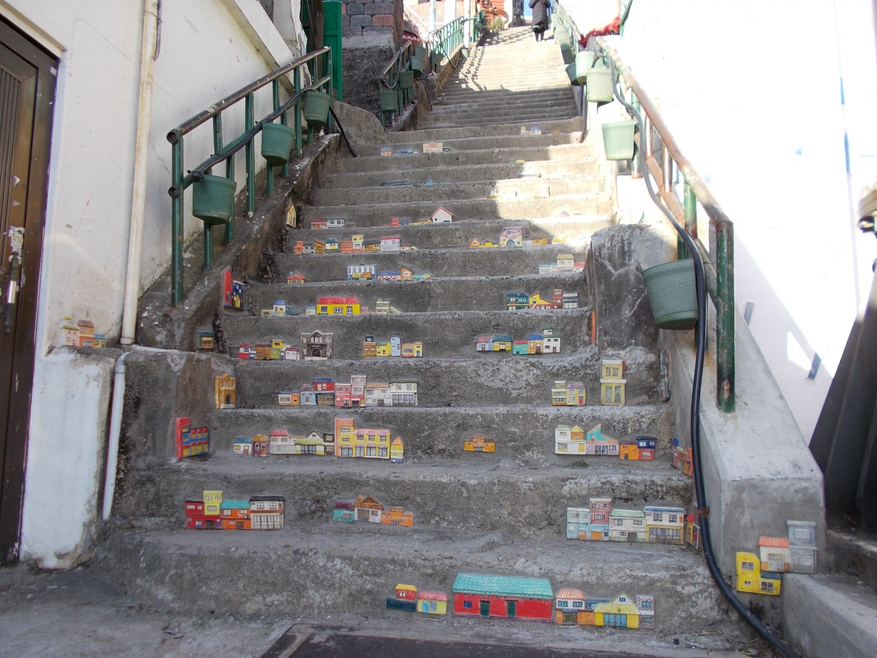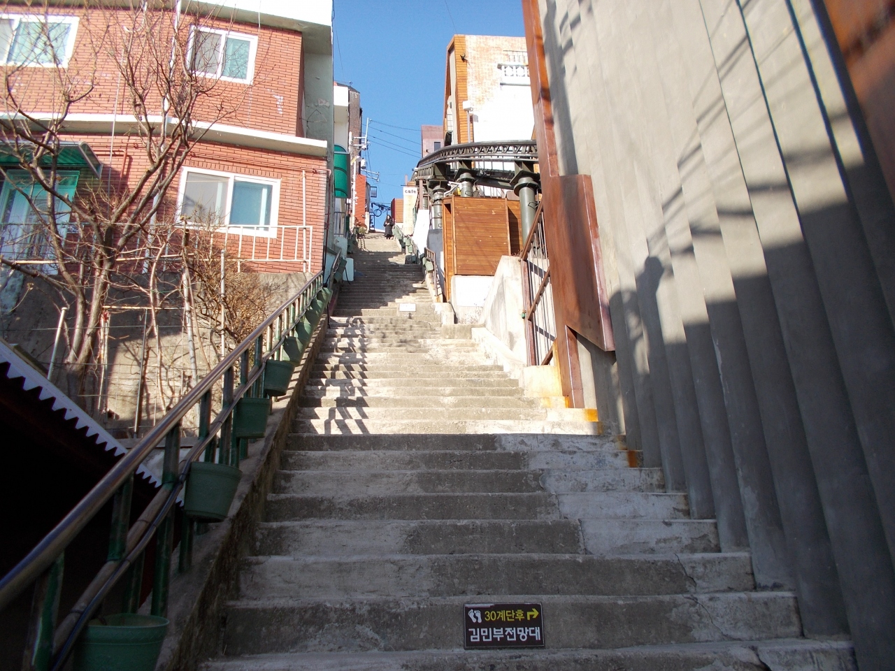 釜山駅の山側を登ったところに168階段があります。この階段、私は登りがおすすめに思います。階段の中心ぐらいの階段にかわいい家のイラストが書かれています。下りだとその絵は振り返って見るようになります。そして、下りは、階段のたいへんの人のために、エレベータのようなモノレールがあります。せっかくなので乗ってみるのもよいと思います。