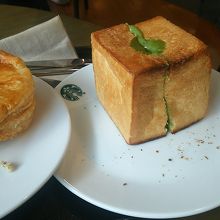 ミートパイと、キューブ型で、中にクリーム(ピスタチオ?か、ずんだに近い味がしました)が入ったパンをオーダー。